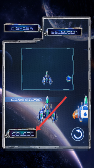 2、在星际雷电战机的战机选择界面,点击【SELECT】,选定“FIRESTORM”战机,准备投身战斗。
