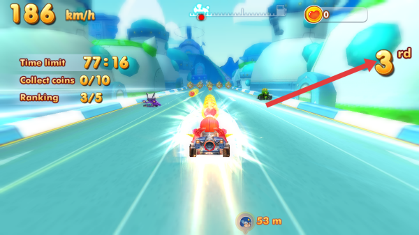 2、在赛车的比赛中,需要关注右上角排名(当前3rd),在时间限制内提升名次,同时收集金币。