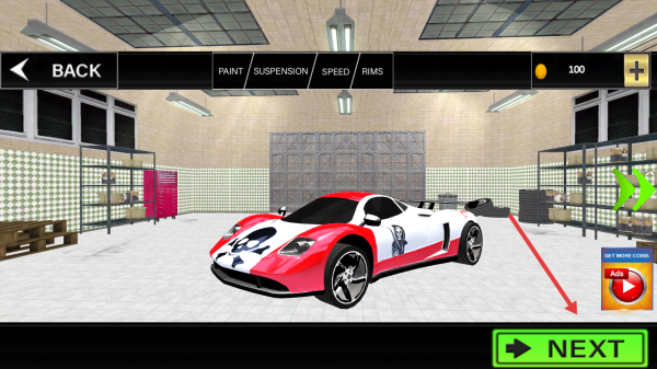 2、车库选定红白涂装赛车,点击【NEXT】,进入赛道挑战。