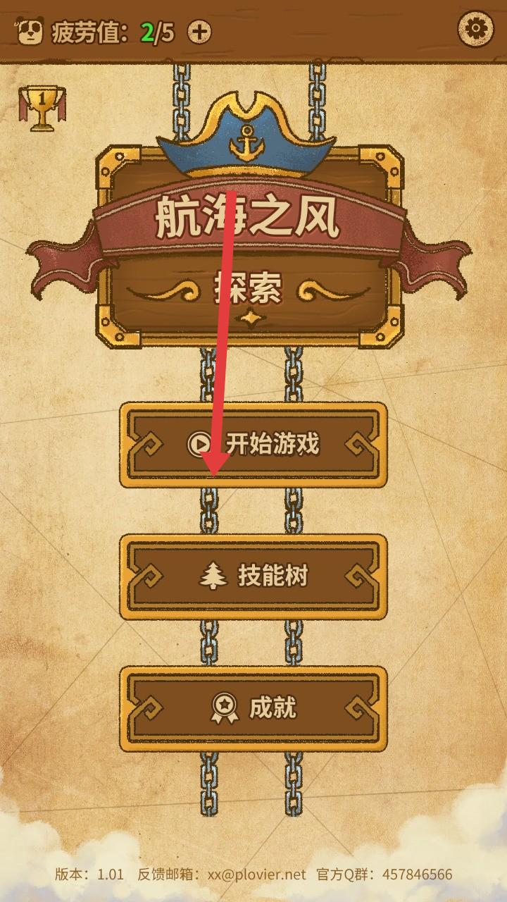 1、进入主界面,先看疲劳值(2/5),点击【开始游戏】开启航海,也可先逛【技能树】【成就】了解养成与目标。