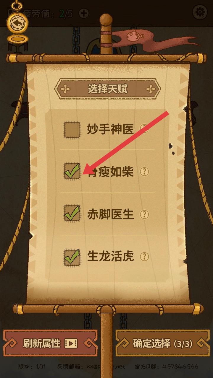 3、到天赋选择,依据玩法选天赋(“生龙活虎”增状态),不满点【刷新属性】换,选好点【确定选择】强化角色。