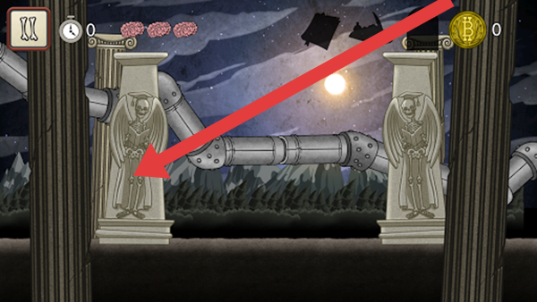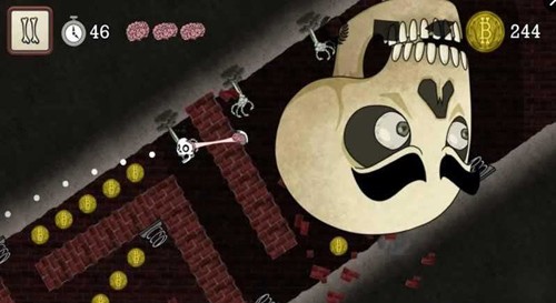 3、在骷髅头场景,沿金币指引路线,利用砖墙掩体躲机关,绕开骷髅头攻击,持续收集比特币,完成迷宫式关卡挑战。