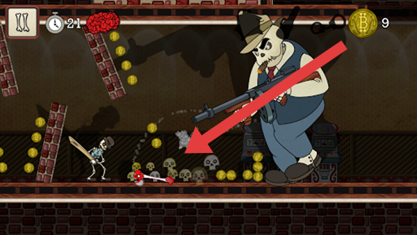 2、遇到持枪胖子敌人,操控骷髅灵活走位,利用场景金币、道具,借助棒球棍攻击,注意躲避子弹,推进关卡。