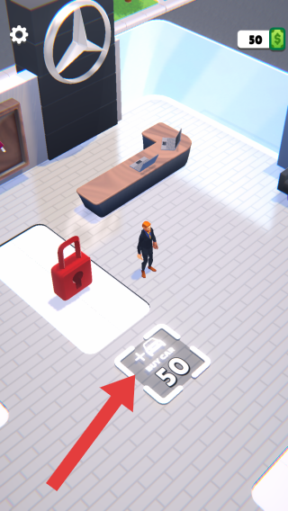 1、画面中显示BUYCAR50(花费50货币购买汽车)的标识、红色锁形道具及货币显示(50),呈现经营汽车销售店、进行购车等操作的场景。