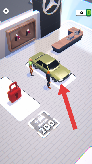 2、展示了汽车经销场景,包含人物、汽车,还有BUYCAR200(花费200货币购车)标识、红色锁形道具及货币显示,呈现经营销售汽车的环节。