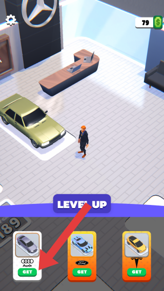 3、呈现汽车经销场景,有角色、汽车,底部有可获取的奥迪品牌汽车图标,还有LEVELUP(升级)提示及货币显示(79),是经营、解锁车辆的环节。