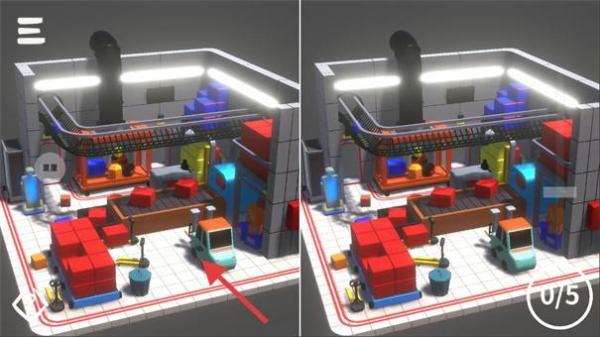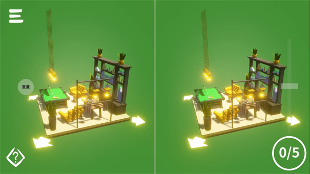 1、观察第一组场景,数黄色箭头、物品(菠萝)差异,标记右侧“0/5”进度。