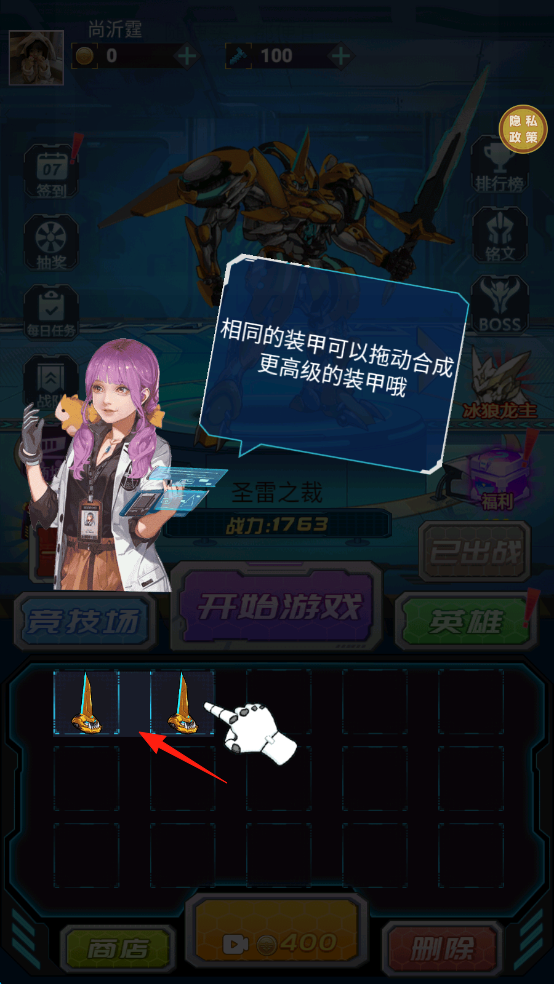 2、在合成界面,拖动相同装甲(如黄色部件),合成更高级装备,提升战力。
