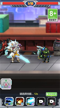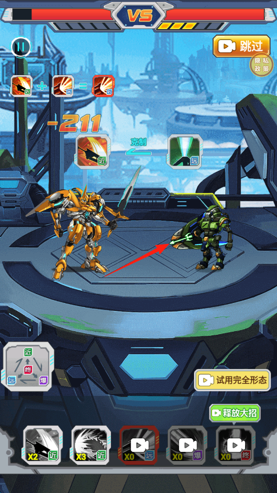 3、对战时,利用技能克制(近/远攻),点击【释放大招】,击败敌方机甲(绿色)。