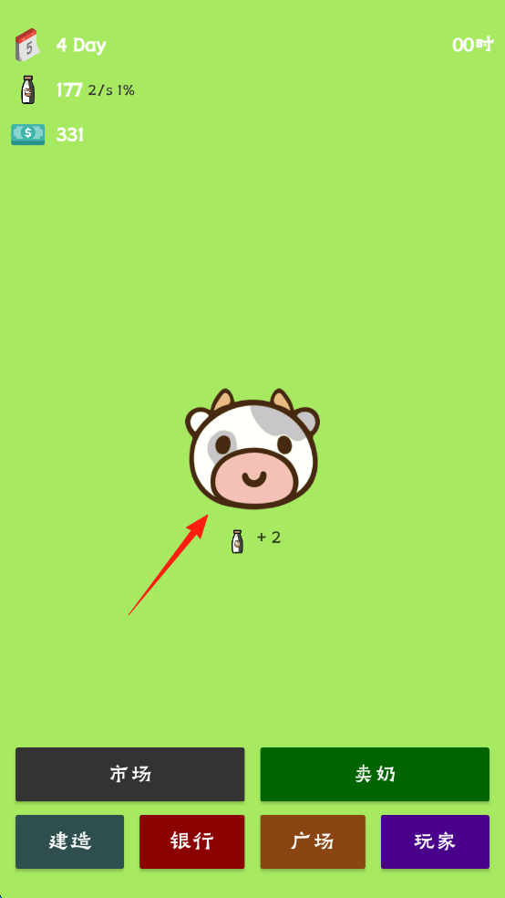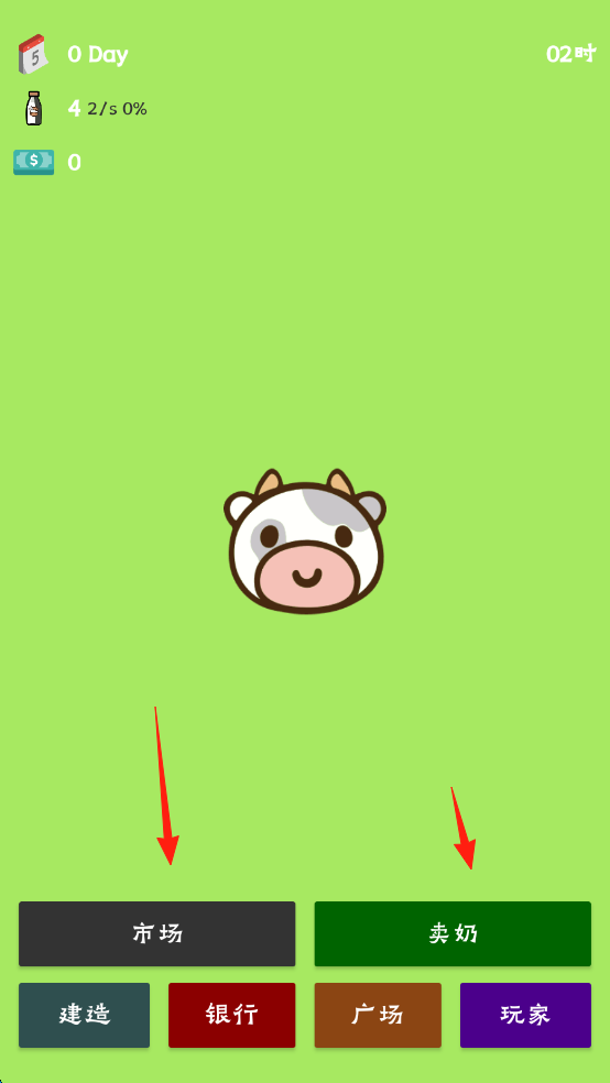3、返回主界面,等待奶牛产奶(+2),可去【市场】采购、【建造】升级,扩大经营。