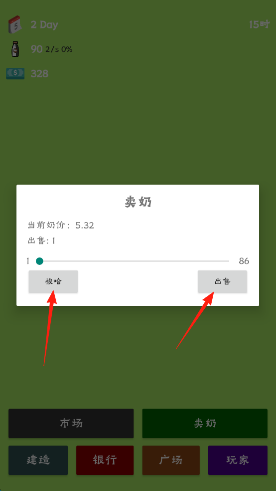 2、卖奶时,根据奶价(如5.32),拖动滑块选出售数量,点击按钮完成交易,积累资金。