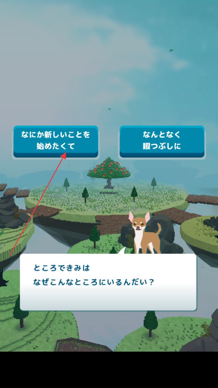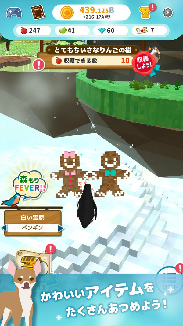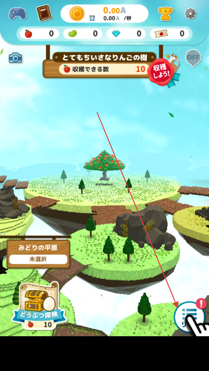 3、在主界面,点击探索按钮(どうぶつ探検),收集资源,培育树木(とてもちいさなりんごの樹),拓展世界。