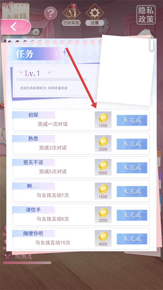2、点击任务,完成各种任务获得好感度,商店购买礼物,在樱花飞舞的校园里约会。