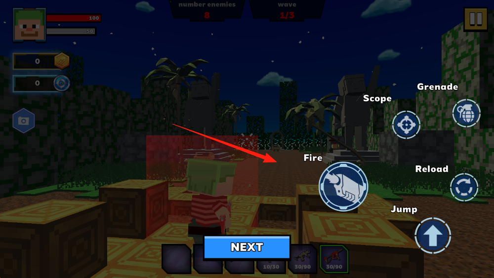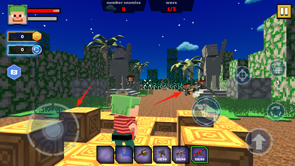 3、关卡中,左手摇杆移动,躲在掩体(木箱)后,右手点射击键,消灭敌方像素角色(红箭头)。
