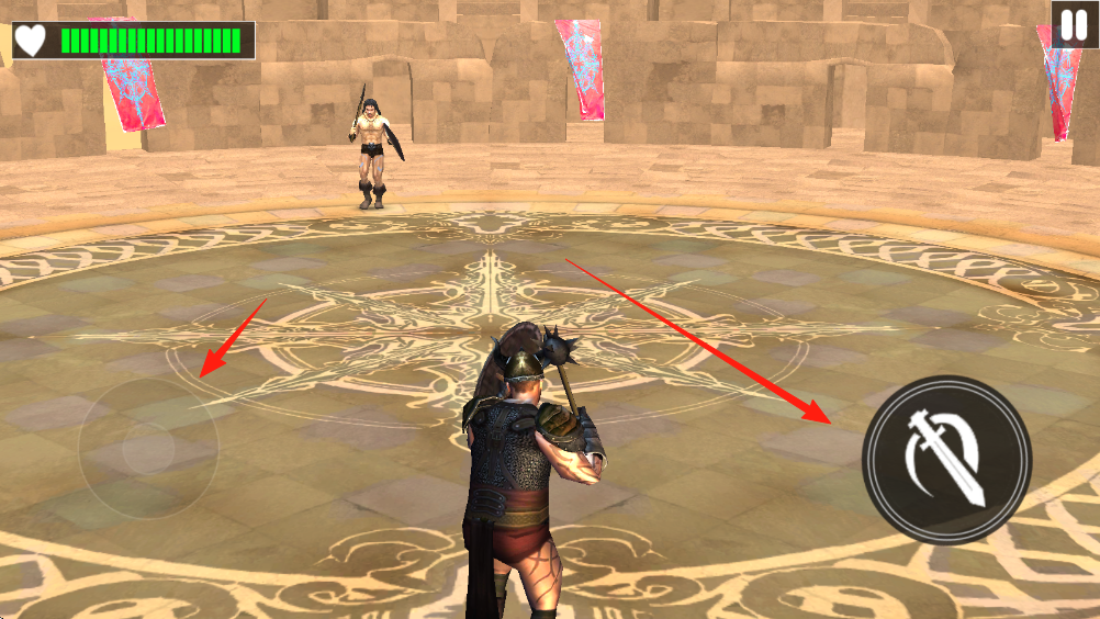3、进入角斗场后,左手摇杆控制移动,右手点击攻击键(sword图标),迎战敌方斗士。