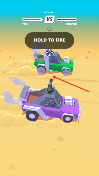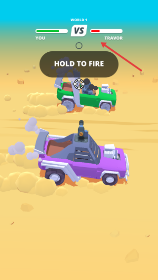 2、长按【HOLDTOFIRE】,发射武器攻击敌方,削减其血条;操控赛车走位,躲避反击。