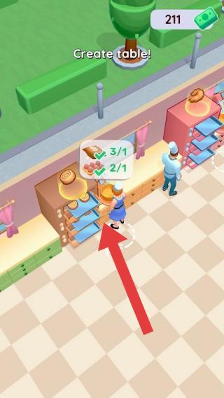 3、呈现面包店场景,有角色、桌椅、操作提示“Createtable”(创建桌子),玩家需进行店铺经营操作,属于模拟经营玩法,通过完成任务推动面包店发展。