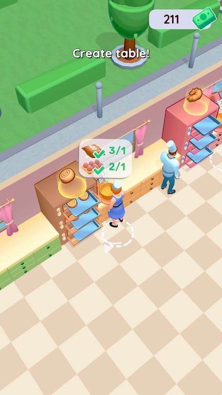 2、从“Createtable”(创建桌子)及面包店场景(烤炉、面包、角色服饰)看,玩家需完成经营任务(如制作、布置等)推动店铺发展。