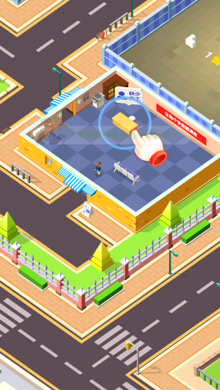 3、玩家扮演驾校老板,画面呈现驾校建筑及操作指引(手指点击标识),用于推进驾校经营管理相关玩法,如布置、升级等操作。