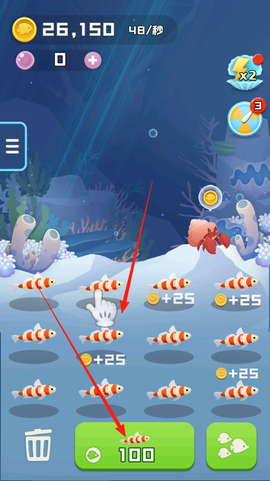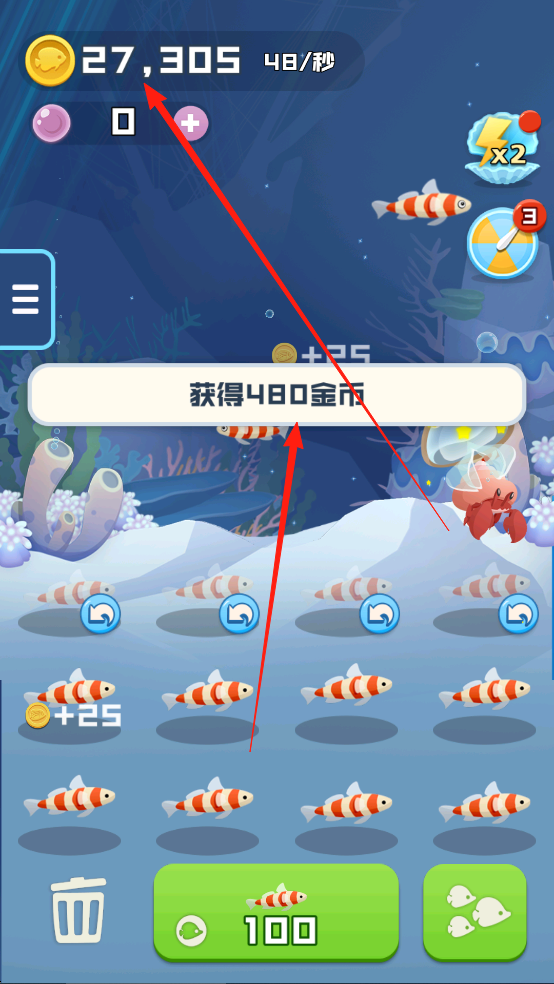 2、合理分配金币扩建展区面积,在深海研究所用贝壳币研究鱼类加速成长科技,定期清理藻类杂物保持水质避免鱼类生病。