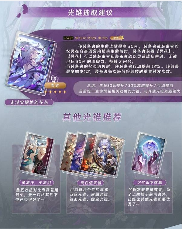 1、光锥抽取优先专武【走过安眠地的花丛】,其提供生命30%提升、30%减防及行动提前效果,也可选择【记忆永不落幕】等适配光锥,按需搭配。