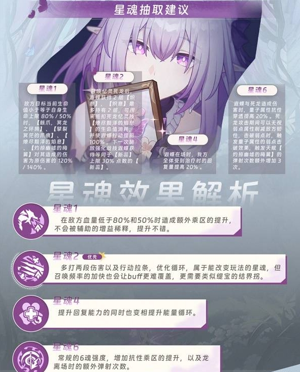 2、星魂效果解析:星魂1提升残血额外伤害,星魂2优化伤害循环,星魂4增强回复与能量循环,星魂6增加抗性及弹射次数,按需抽取核心星魂。