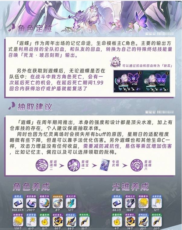 3、遐蝶是生命模板主C,靠全队扣血与队友回血攒终结技;建议保底抽取本体,养成需储备角色突破、光锥升级材料,提升实战能力。