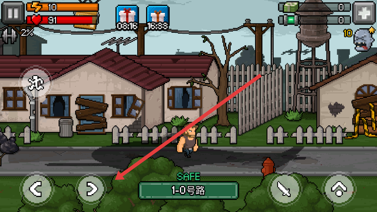 3、关卡场景中,操控角色移动至“1-0号路”,沿箭头方向探索,收集资源、躲避/攻击僵尸,推进生存挑战。