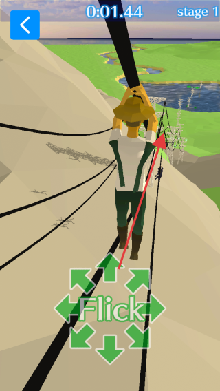 2、在stage1,按【Flick】提示滑动操作,操控角色沿电线行走,躲避障碍,保持平衡,向箭头指的方向前进。