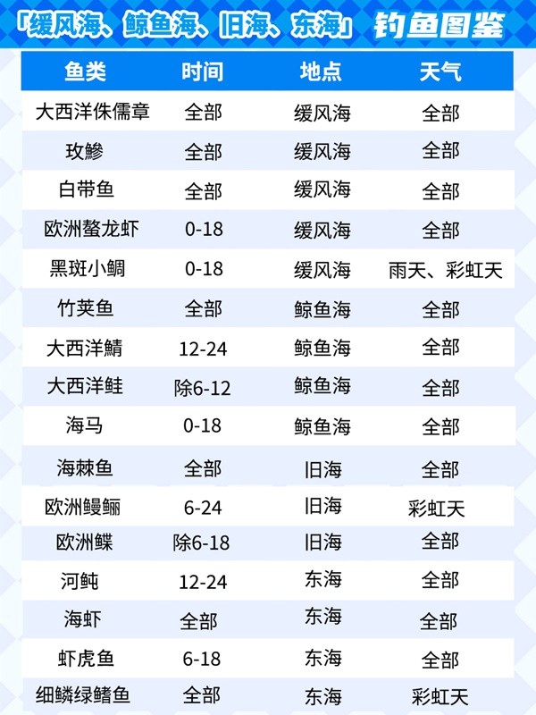 3、缓风海钓大西洋侏儒章等(欧洲螯龙虾0-18点),鲸鱼海钓竹荚鱼等(大西洋鲭12-24点),旧海、东海按图鉴条件垂钓。