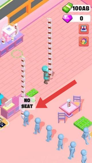 1、显示NOSEAT角色、货币(100AB)、钻石等元素,属于休闲益智的解压,玩法是经营餐厅、安排顾客就座等。