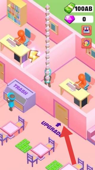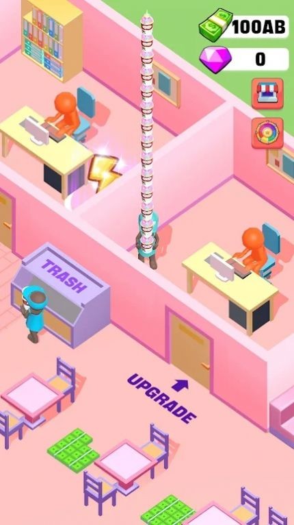 3、呈现办公场所场景,有角色、货币(100AB)、钻石(0)、“UPGRADE(升级)”提示等,玩法应是经营管理空间、升级设施、服务角色,属于休闲益智的模拟经营品类。