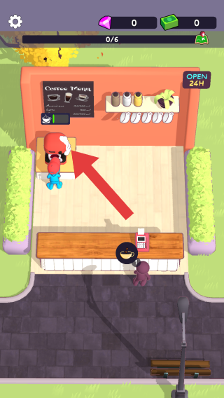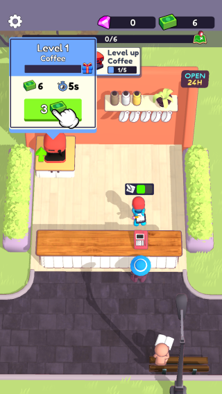 2、呈现了咖啡店经营场景,有“OPEN24H”(24小时营业)标识,上方显示资源(钻石0、现金0,进度0/6),属于模拟经营咖啡店的玩法展示。