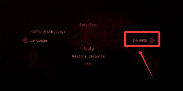 3、在""Gameplay"页面中,点击"Language"一栏最右侧的箭头进行语言切换,当语言一栏变为"ZH-HANS“时,点击"apply""即可。