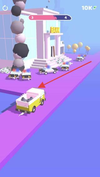 2、路过【BANK】时,开黄色卡车,躲警察围堵、落石,快速通过银行区域,积累逃脱进度。