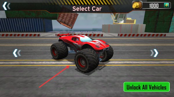 2、选车界面选定红色大脚车,点击确认(或【Unlock AllVehicles】解锁全部,可选其他车)。