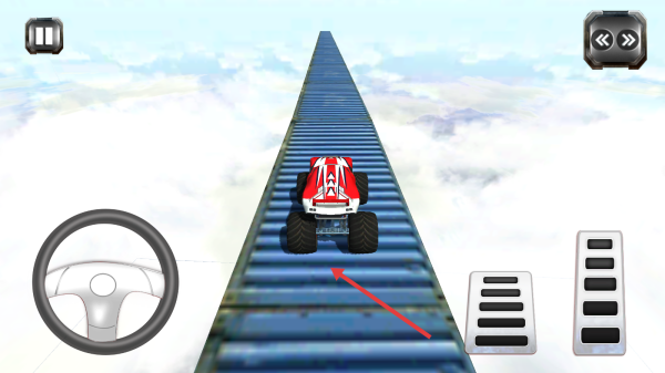 3、驾驶时用方向盘控制方向,踏板控制加速/刹车,沿高空轨道行驶,完成特技挑战。