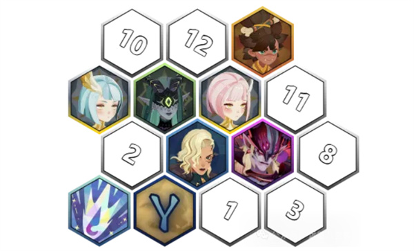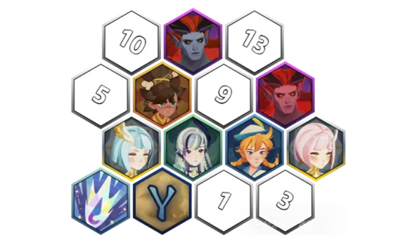 1、六边形布阵核心:以固定六边形格为布阵单元,数字格(1、2、3等)与角色格组合,构建战斗阵型,不同位置(如中心“Y”格、边角格)影响角色联动。