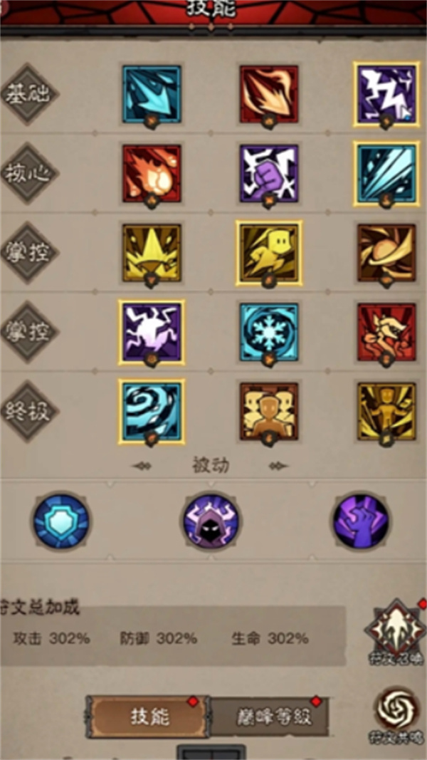 2、技能配置:技能分基础、核心、掌控、终极等层级,搭配不同特效技能(如突进、爆发、控场),符文总加成攻击、防御、生命均302%,依战斗需求切换技能组合。