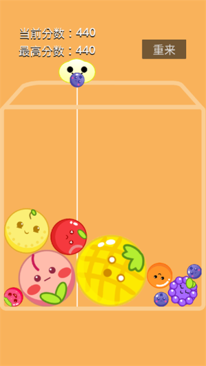 2、操作方式极为简单直观,玩家仅需通过点击或滑动屏幕即可完成水果合并,无需复杂技巧学习,三秒内即可轻松上手。