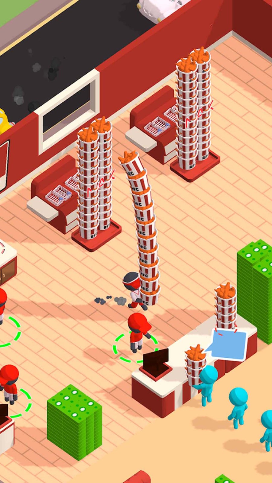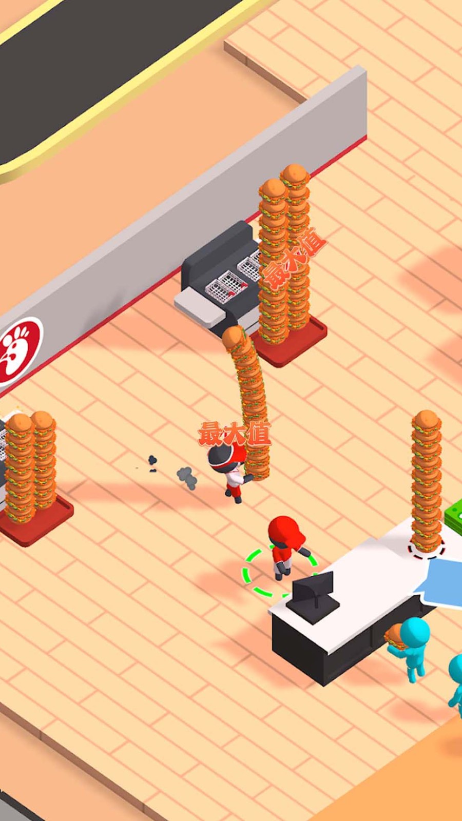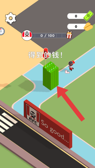 1、画面中有角色、钱币堆、类似肯德基恶搞的广告牌,还有资源显示,呈现的是收集金钱的场景,属于僵尸题材的经营或冒险。