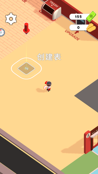 2、画面呈现经营场景,有创建表、角色、资源显示、UPGRADE标识及店铺设备,属于店铺建设、经营拓展的环节。