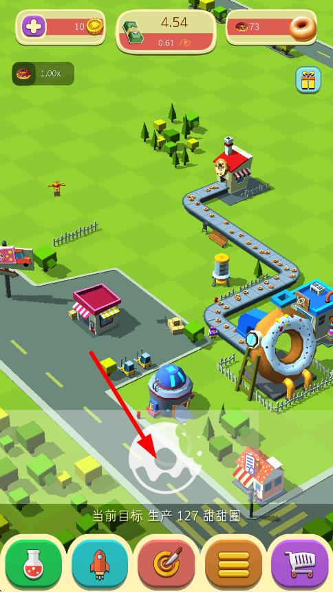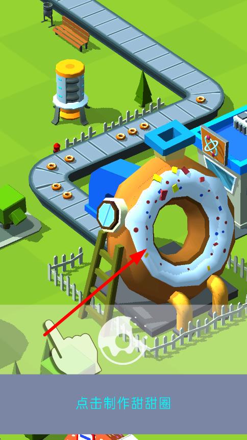 1、进入游戏后在工厂界面点击制作基础甜甜圈,拖动至货架上架销售,通过点击屏幕加速生产获取初始金币。