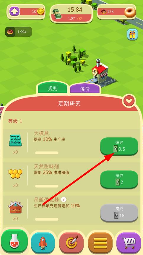 2、使用金币升级烤箱搅拌机等设备,解锁草莓巧克力等新食材,在研发台研究特色食谱提升甜甜圈售价。