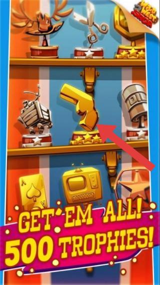 2、呈现奖杯收集系统,有GETEMALL!500TROPHIES!(收集全部!500个奖杯)的提示,展示了如金色手枪等不同造型奖杯,属于该模拟经营成就收集。