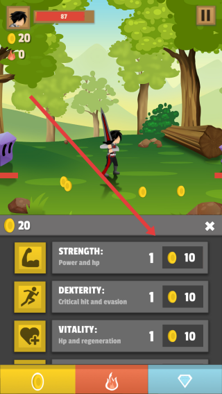 2、打开属性面板,消耗金币(如10金币),升级“STRENGTH”等属性,提升角色战力,强化生存能力。