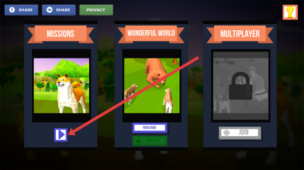 1、在模式页,点击【MISSIONS】的播放按钮,进入狗狗任务模式,开启动物模拟冒险。