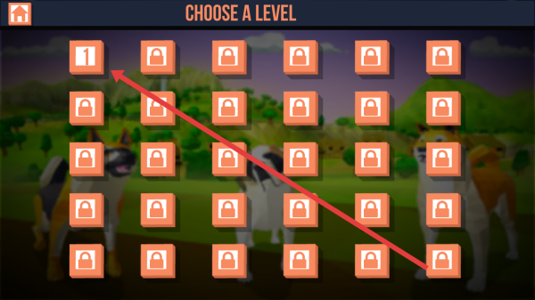 2、关卡选择界面,点击【1】号关卡(唯一解锁),操控狗狗角色,进入任务场景,推进游戏进程。