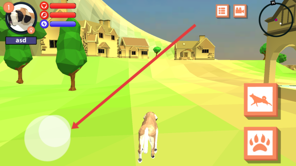 3、游戏中,滑动左侧摇杆(箭头标记)控制狗狗移动,在乡村地图完成探索、互动任务,体验玩法。