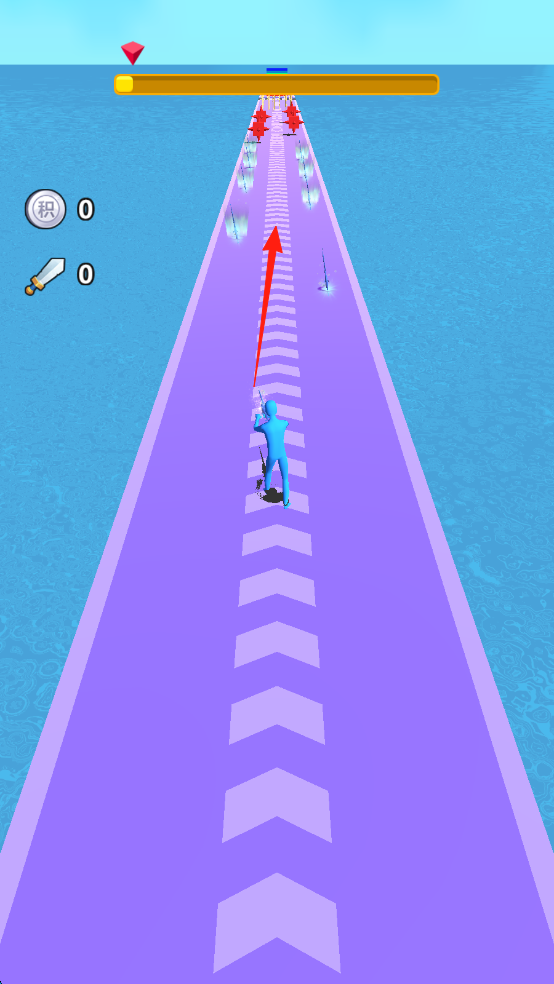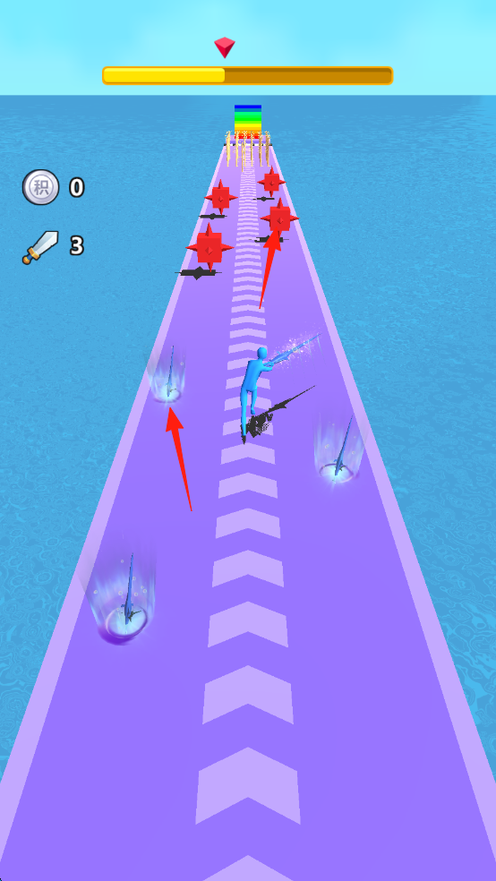 1、点击屏幕,操控蓝色角色,沿紫色跑道前进,躲避红色敌人(箭头)。